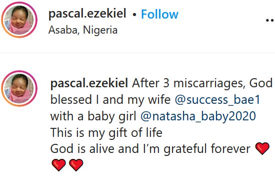 He captioned the photos thus: ''After 3 miscarriages, God blessed I and my wife @success_bae1 with a baby girl @natasha_baby2020