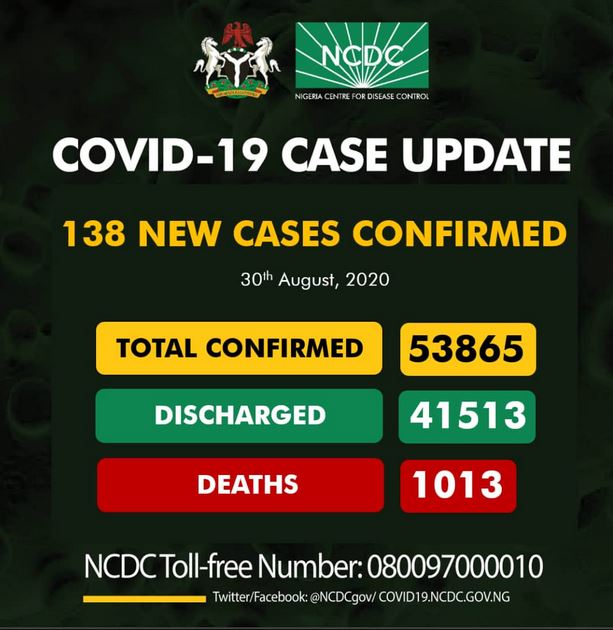Nigeria's Coronavirus cases dropped to 138 on Sunday August 30 as confirmed by the Nigeria Centre for Disease Control (NCDC).