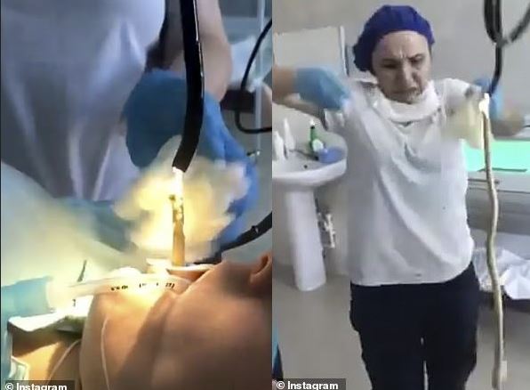 During her operation, a doctor was filmed removing the snake after inserting a tube down her throat.
