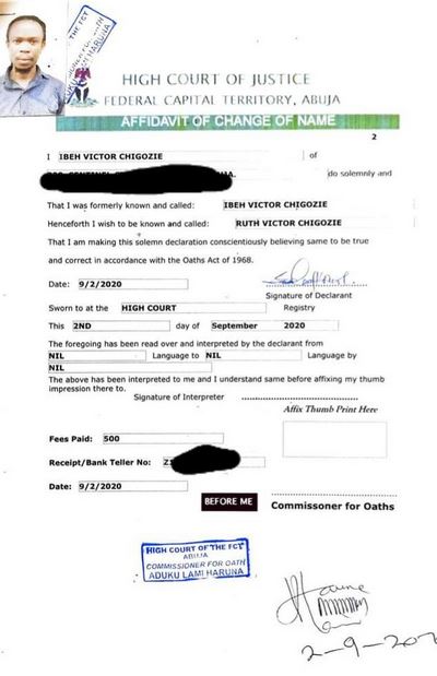 Victor Ibeh, who now goes by Victor Ruth (Ruth being his mother's name), took to Facebook to rejoice after the court granted his request.