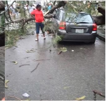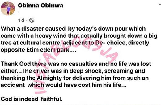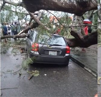 One Obinna Obinwa, who shared the story online, explained that the tree fell because of a heavy downpour which came with heavy winds.