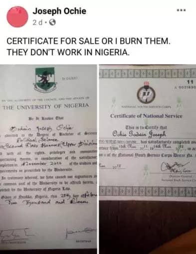 Ochie, who is from Enugu State put up his Bachelor of Science (Bsc) and National Youths Service Corps (NYSC) certificates for sale on Social Media (Facebook) on Saturday, August 30, 2020.