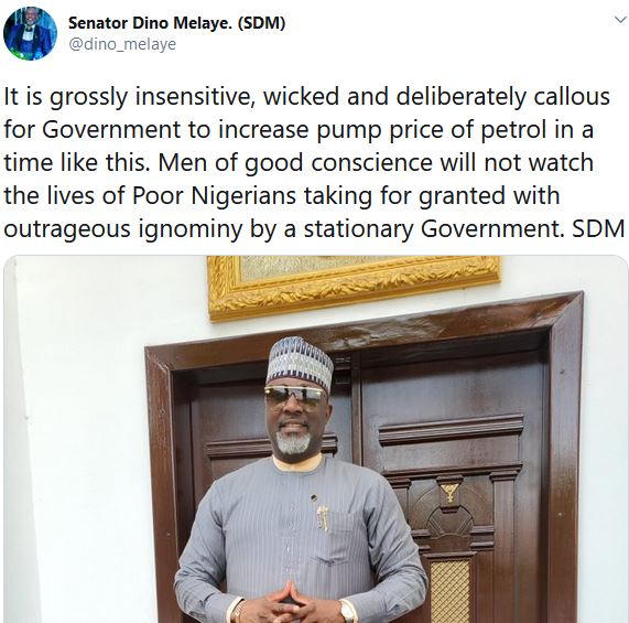Melaye on his Twitter page wrote: “ It is grossly insensitive, wicked and deliberately callous for Government to increase pump price of petrol in a time like this.