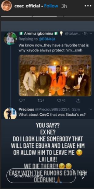 BBNaija star, Cee-C has fired back at social media users who are making allegations of her having a romantic affair with media personality and show host, Ebuka.
