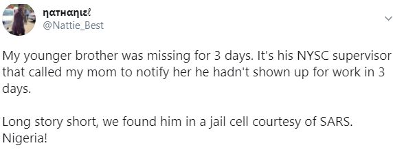 Nathaniel who tweeted on his Twitter handle @nattie_best narrated how his brother who went missing during his NYSC programme, was allegedly found in SARS cell after three days.