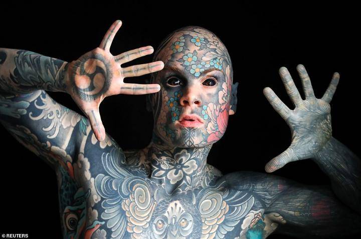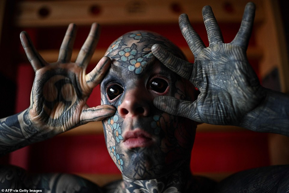 His body, face, and tongue are covered in tattoos, and the whites of his eyes were surgically turned black.