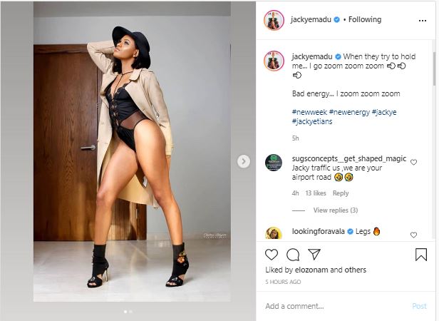 Big Brother Naija: “Pepper Dem” housemate, Jackye Madu has stunned her followers by flaunting her long legs in sexy new photos.