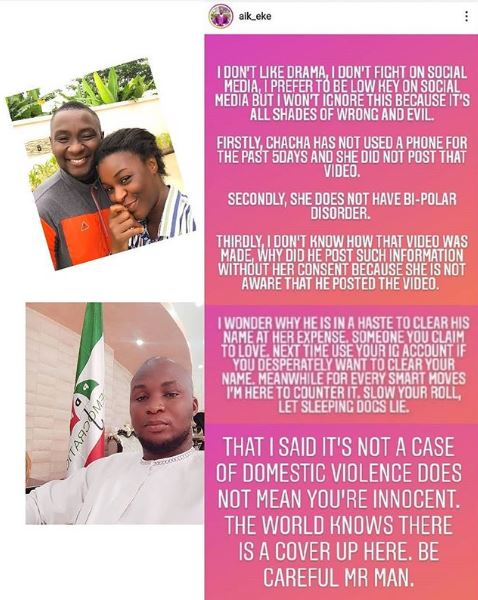 Actress Chacha Eke's brother, Aik Eke has accused Austin, the husband of Chacha Eke of masterminding a post on the actress' page telling the world that she has bipolar.