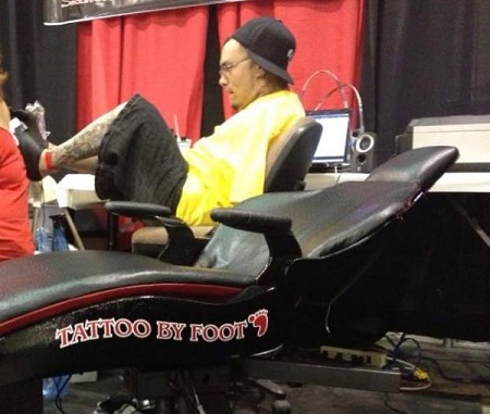 Brian became a certified tattoo artist 11 years ago, but actually finding a shop that would hire him proved a much more difficult task. He applied to a number of local tattoo shops, but all he got was promises that they’d give him a call when a position opened up. He never got any calls back, but instead of giving up, Tagalog just decided he would have to become his own boss in order to practice his craft. Now Brian runs “Tattoo by Foot” his very own shop, where he actually tattoos clients by foot.
