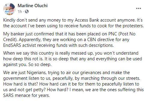 Marline Oluchi revealed that her banker told her that they are working on a CBN directive for any #EndSARS activist receiving funds with such descriptions.