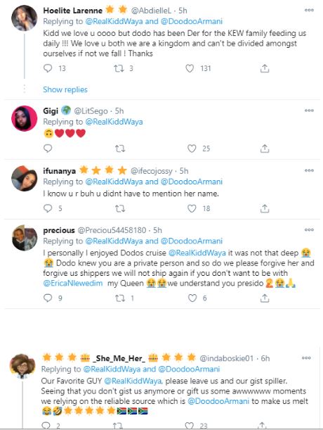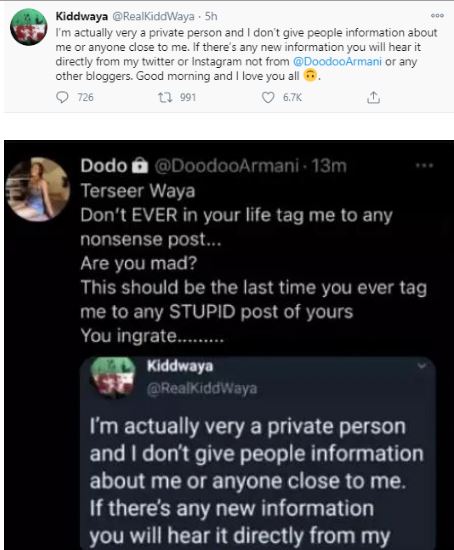 “I’m actually very a private person and I don’t give people information about me or anyone close to me. If there’s any new information you will hear it directly from my twitter or Instagram not from @DoodooArmani or any other bloggers. Good morning and I love you all.”