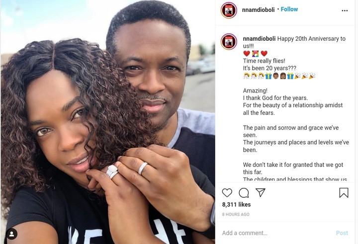 Actress, Omoni Oboli and her husband, Nnamdi Oboli on Wednesday celebrated their 20th wedding anniversary with a lovely note.