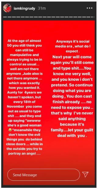 “Aunty for 4years we haven’t spoken, but every 18th of November you come out as usual to type shit ….and they end up saying “awwww she’s a good woman” meanwhile they don’t know the evil things you do behind close doors … while in the outside you try to portray an angel” Paul said in a new post.