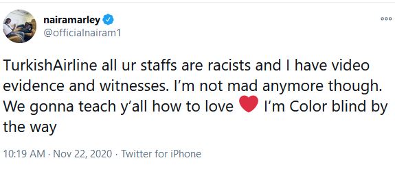 “Turkish Airlines all your staffs are racists and I have video evidence and witnesses. I’m not mad anymore though. We gonna teach you all how to love. I’m color blind by the way,” he wrote.