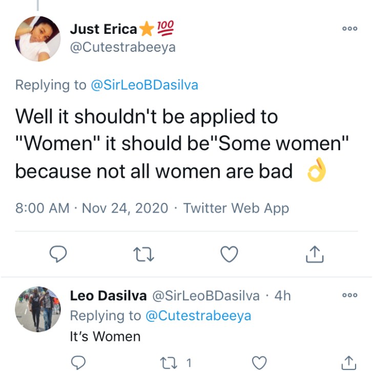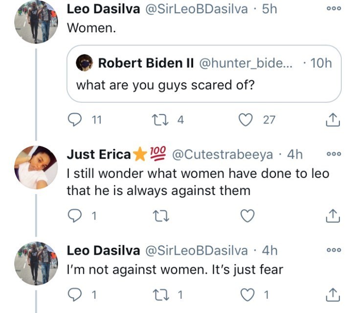 His statement caught the attention of a Twitter user called Just Erica, to quiz him on why he is always against women.