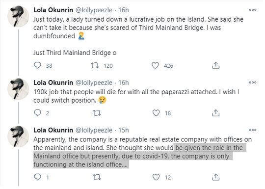 Madam said she can’t take the job. She’s scared of plenty water and Third Mainland Bridge. A staff even offered to be bringing her from Alapere where she stays, she didn’t accept. She said she has heard a lot about the bridge... a lot bii ti bawo? She no need job. 3mb phobia"