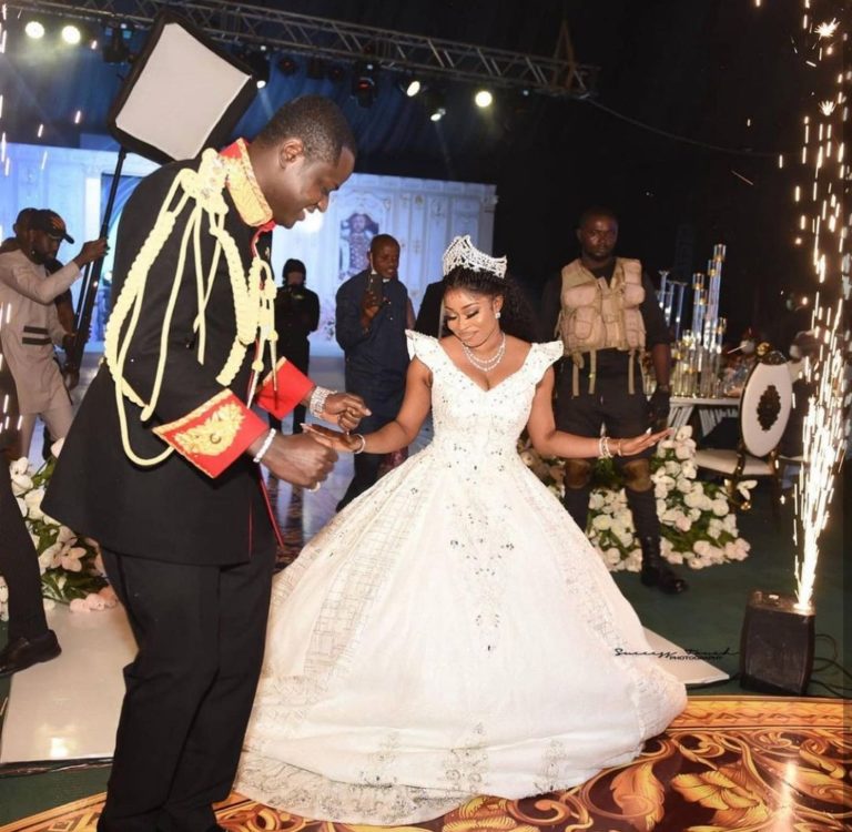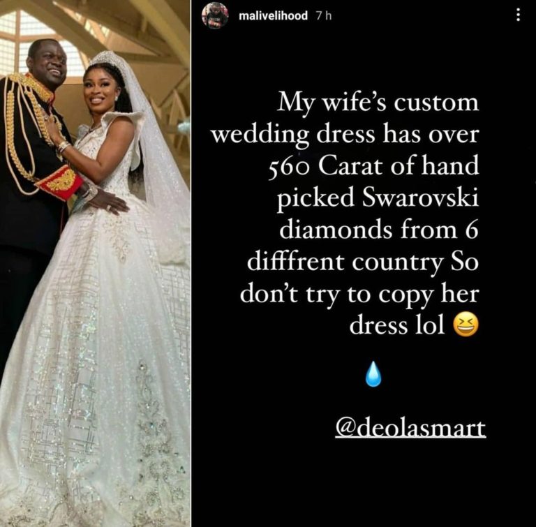 Nigerian luxury jeweler, Malivelihood has bragged that his wife's wedding dress has over 560 carat diamonds.