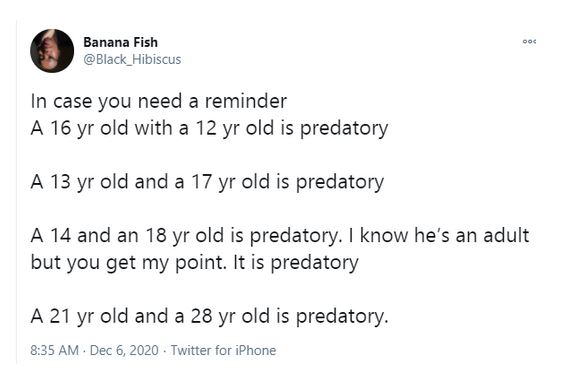 A Twitter user took to the platform to give her two cents about dating ages she feels are wrong and predatory.