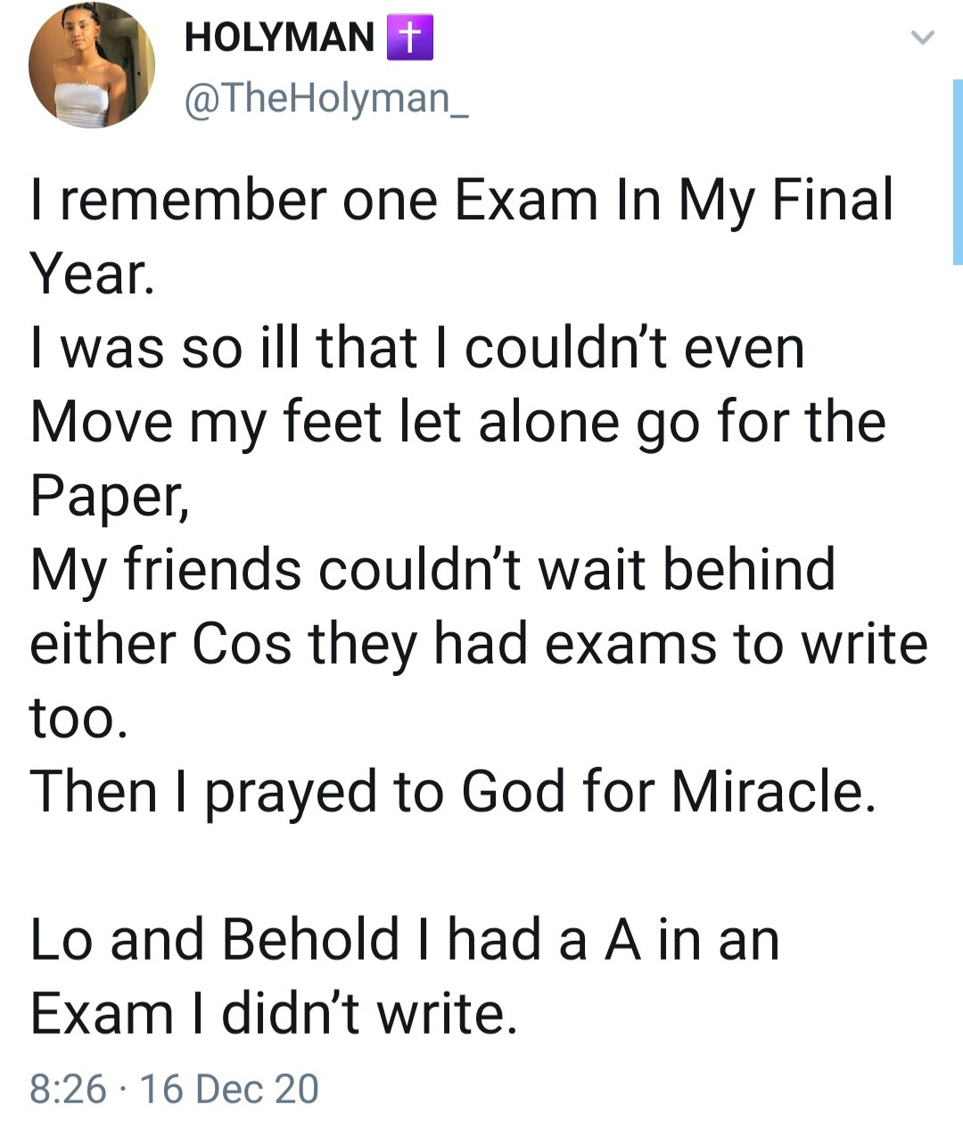 Sharing the supposed testimony, the Twitter user wrote: "I remember one Exam In My Final Year.