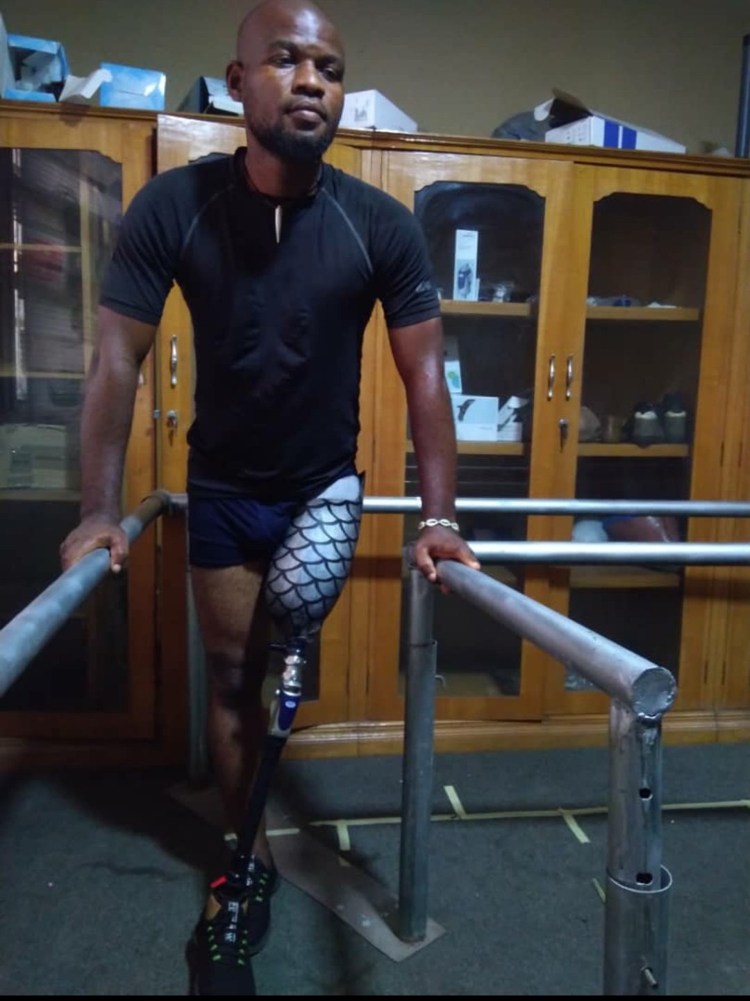 ”Charles lost his prosthetic leg to police brutality, today he has started gait training thanks to your donations.
