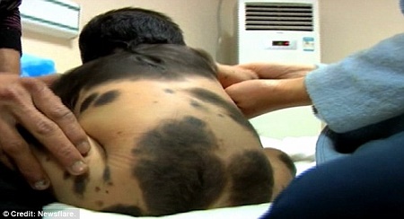 A mother and father have been left distraught because of a rare disease afflicting their son which has forced furry hairs to grow on some parts of his body. Zhang Daojiang, the boy’s father, who is a construction worker and his mother who works in a small restaurant in the city discovered his face, neck, hands, back and buttocks completely covered with dark hairy moles when the baby boy was born some years ago.