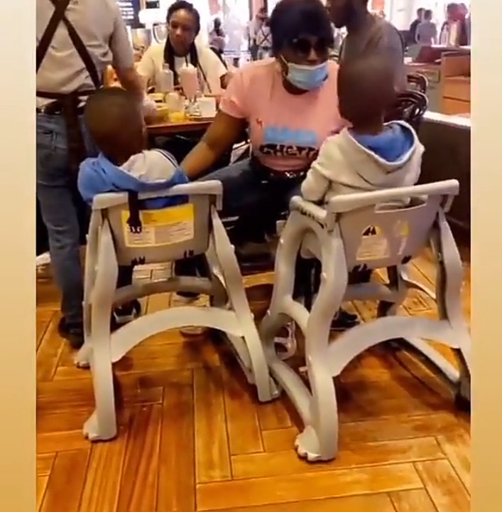 In some of the videos shared from the ongoing vacation, Funke’s twin boys are seen having fun with at a restaurant and in their hotel room in Jumeirah, Dubai.