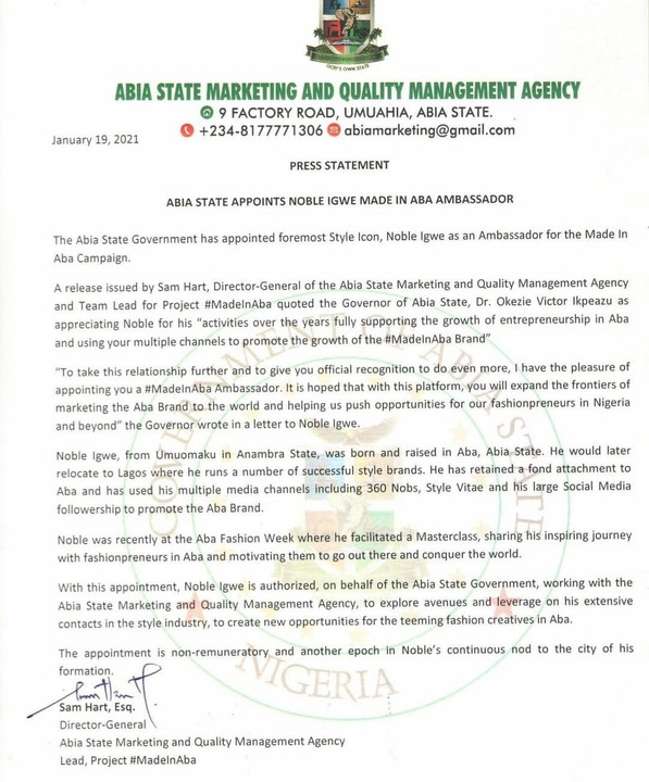The government of Abia state has given Nigerian entrepreneur and media personality, Noble Igwe an ambassadorial appointment.
