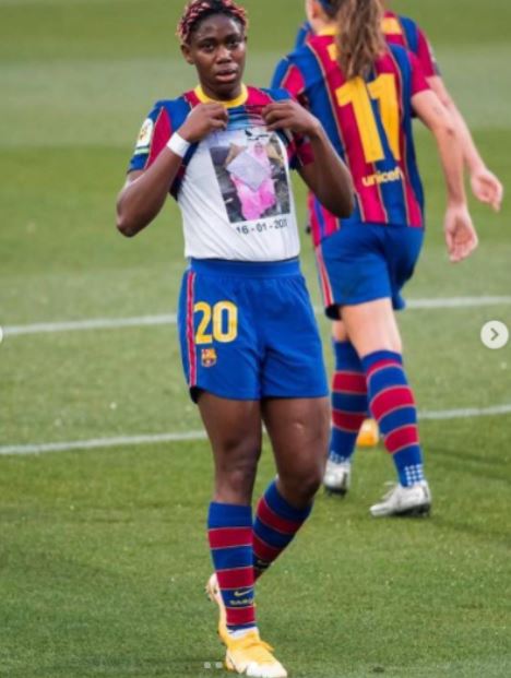 Asisat Oshoala, the Nigerian footballer who is currently the African female African player of the year honoured her late step-mother during the match between FC Barcelona and Rayo Vallecano at the Estadi Johan Cryuff yesterday evening.