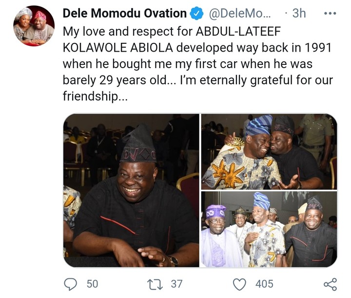 “My love and respect for ABDUL-LATEEF KOLAWOLE ABIOLA developed way back in 1991 when he bought me my first car when he was barely 29 years old… I’m eternally grateful for our friendship,” wrote Momodu.