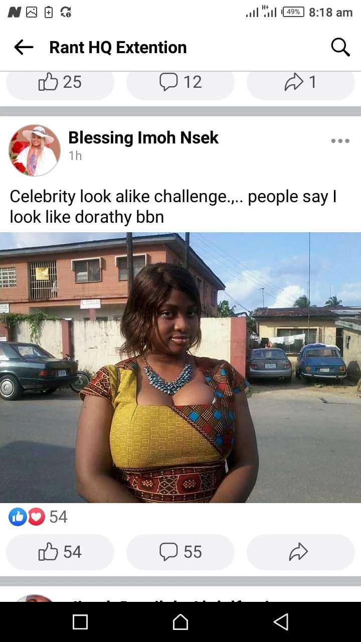 “Celebrity look alike challenge.,.. people say I look like dorathy bbn.”