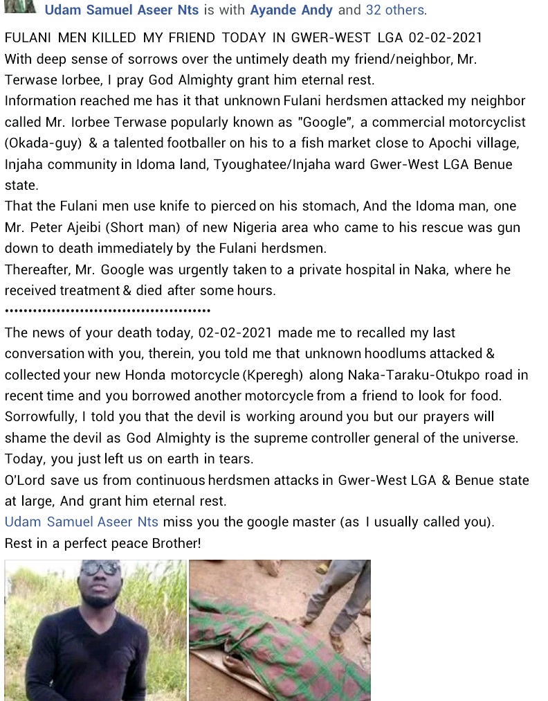 FULANI MEN KILLED MY FRIEND TODAY IN GWER-WEST LGA 02-02-2021