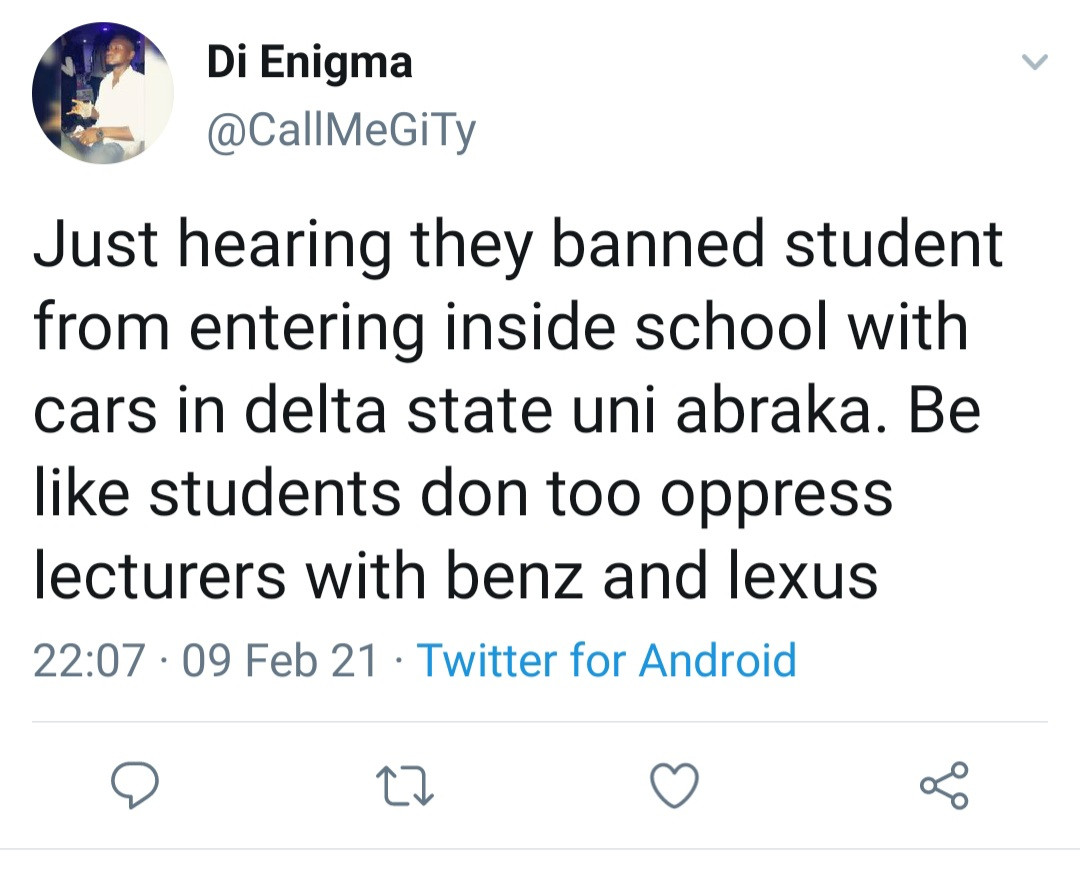 Reports have shown that the Delta State Polytechnic, Ogwashi-Uku, has banned its students from driving cars within the school premises.
