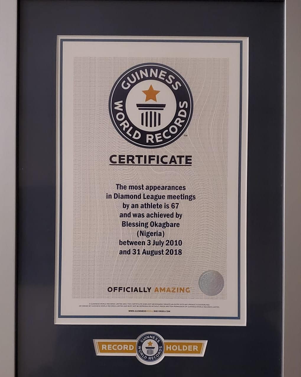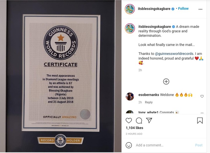 Nigerian athlete Blessing Okagbare has put Nigerian on the world stage after receiving an award from Guinness World Records.
