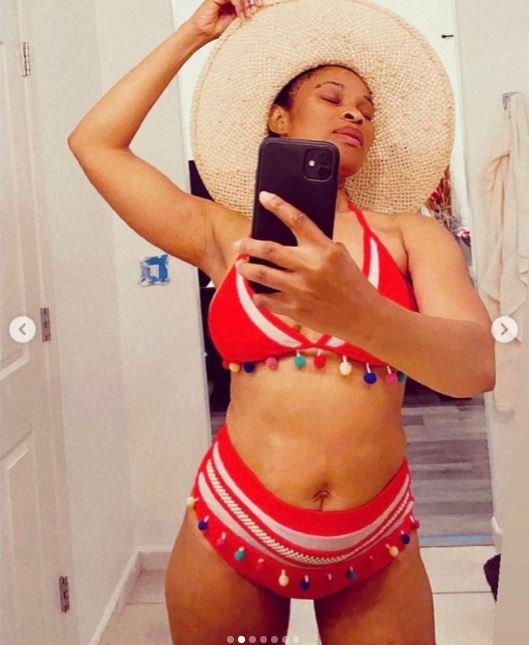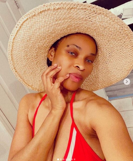 In the photos, the actress is seen rocking a red sexy two-piece with a hat.
