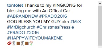 She posted a photo of the brand new 2016 Prado Jeep car and wrote; "Thanks to my KINGKONG for blessing me with An Offical Car #ABRANDNEW #PRADO2016. GOD BLESS YOU MY GUY aka #MrX #MrBigchurch #ChristmasPressie #PRADO #2016 #HAPPYWIFEYOUMAKEME"
