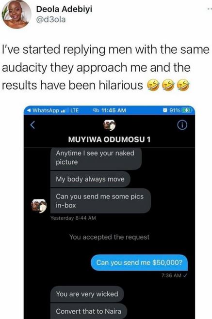 After the man asked her to send him her naked photos in his inbox, the lady responded, asking him to send her $50,000.