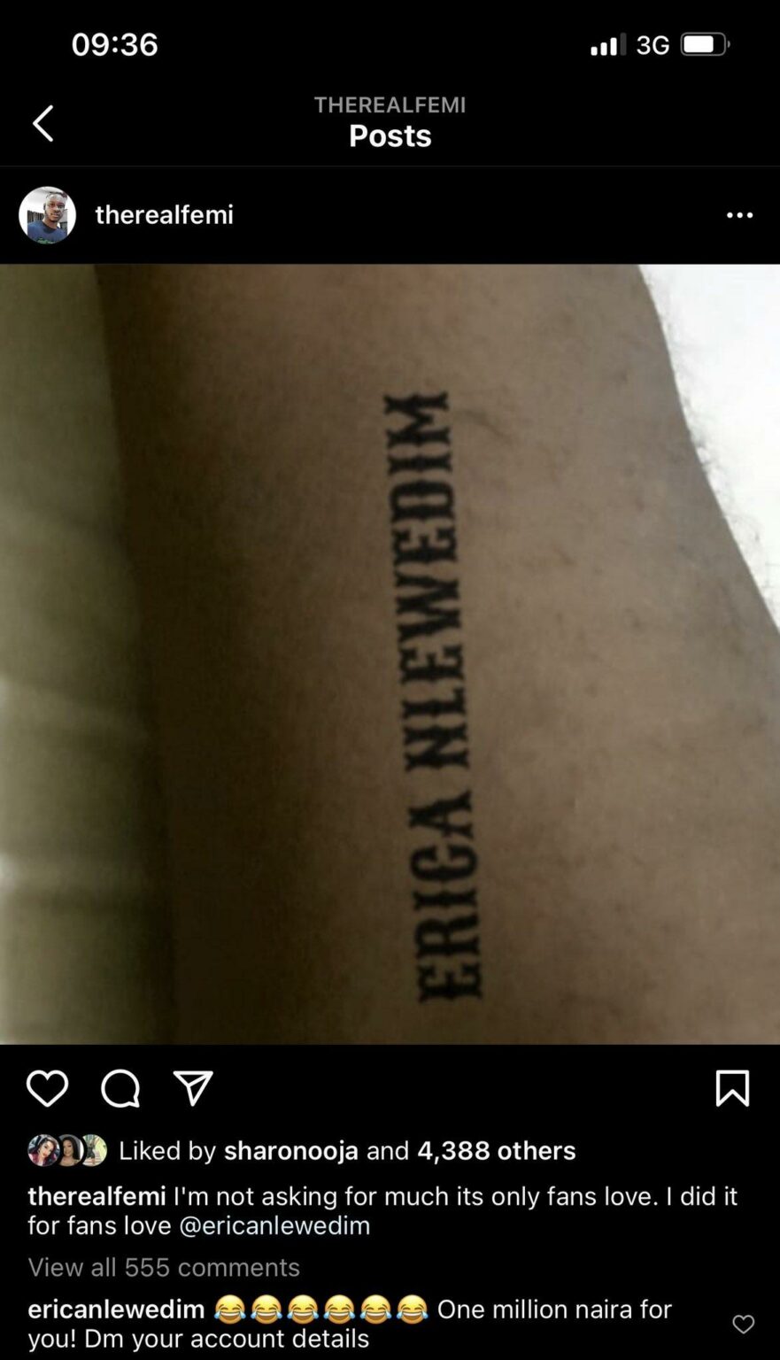 Femi had taken to his Instagram page to share a poorly edited photo of the name “ERICA NLEWEDIN” boldly written on his arm.