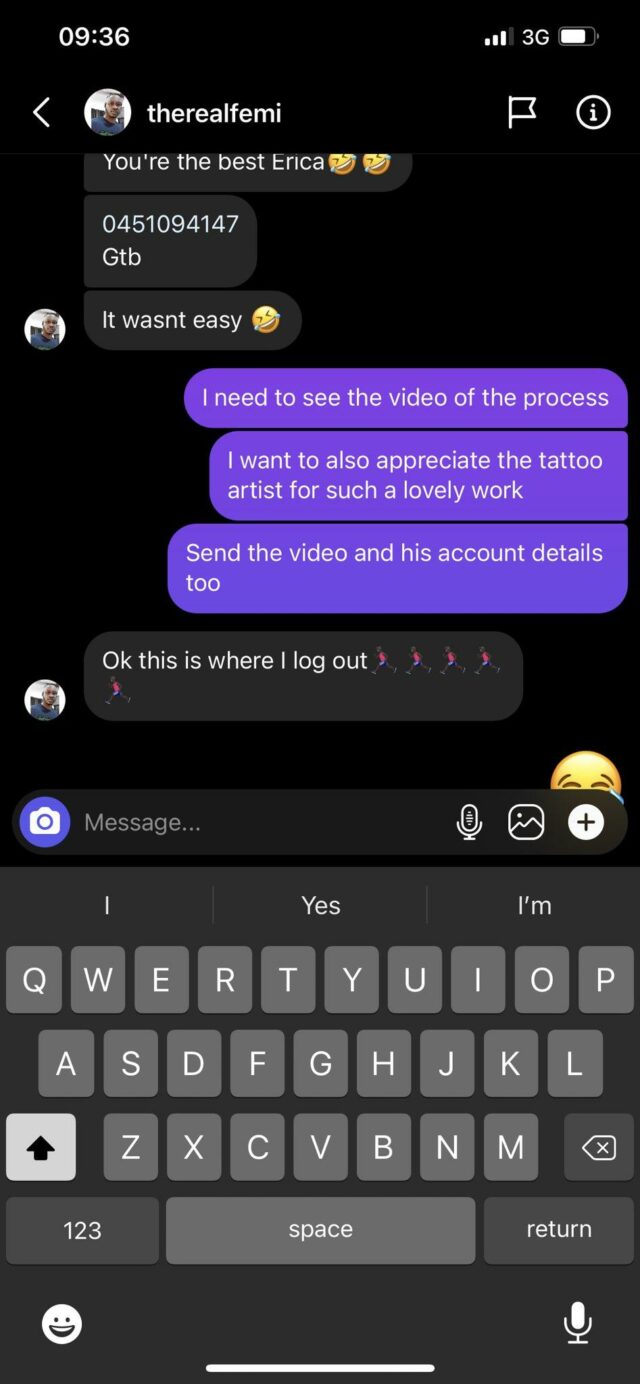 To his utmost shock, Erica asked for a video evidence of the tattooing process so she can equally reward the tattoo artist. Knowing fully well that it was all joke, Femi humbly backed out of the conversation.