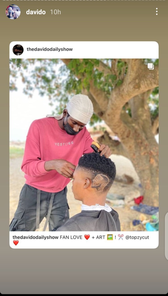 After seeing the photos this morning, Davido acknowledged the barber with a post, writing: “fan love + Art @topzycut”.
