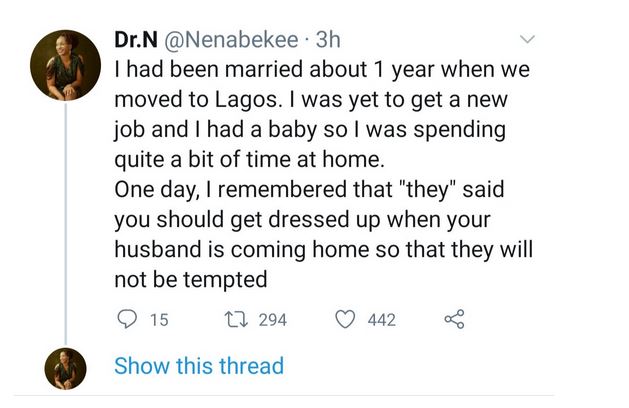 She recalled how she dressed well to make herself appealing to her husband when he returned from work as people advice newly married women, but when her husband saw her, he asked if she was going out.