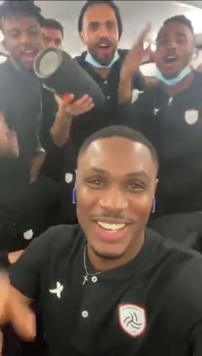 After the match, Ighalo and his teammates celebrated the match win in the dressing room by dancing to a song by Davido.
