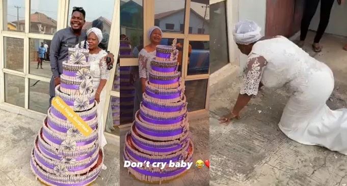 Mr. Macaroni hired a professional gift and surprise company to create a tall money cake and also recruited a poet, Oriki to shower his mum with a lovely recital.