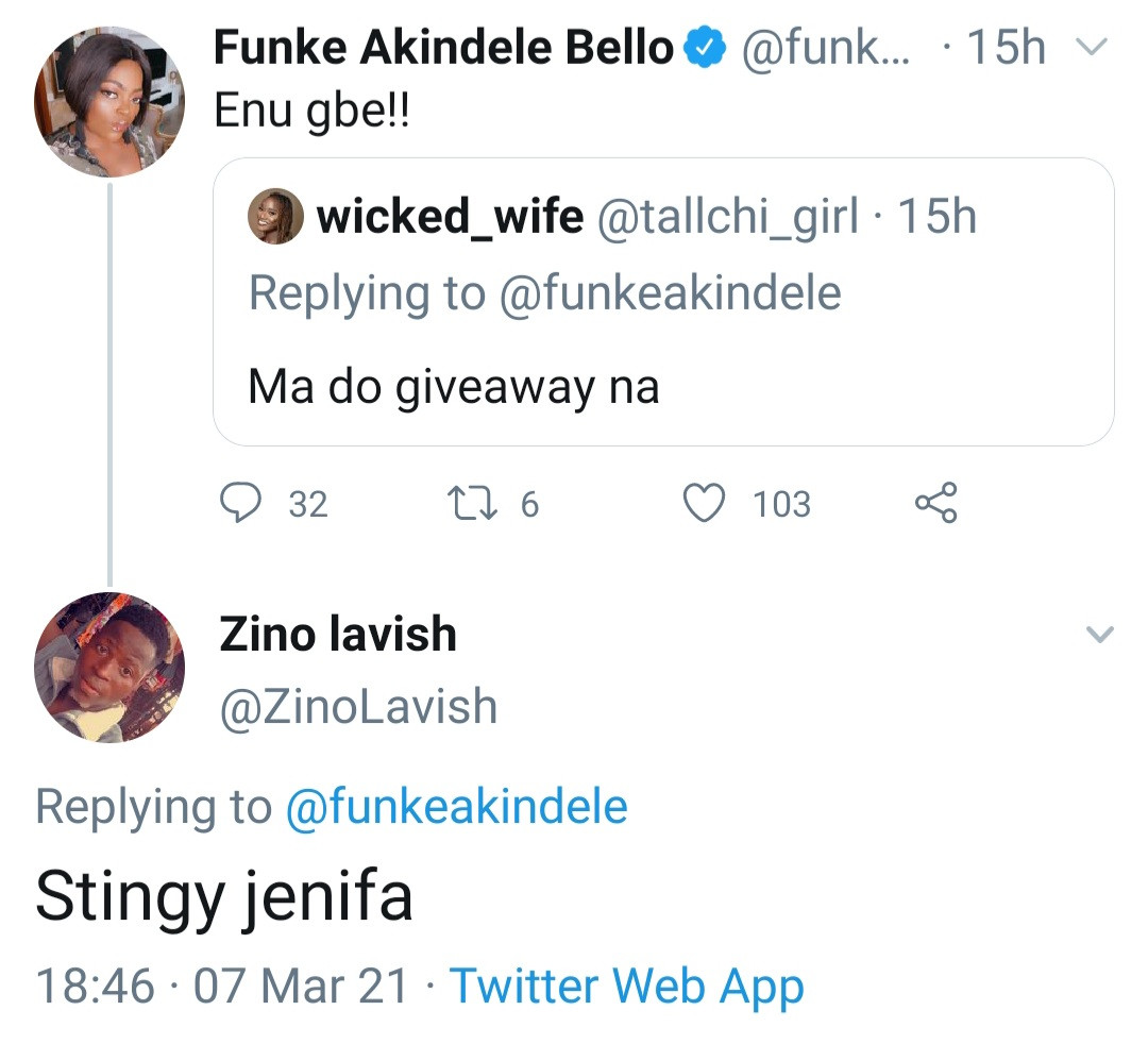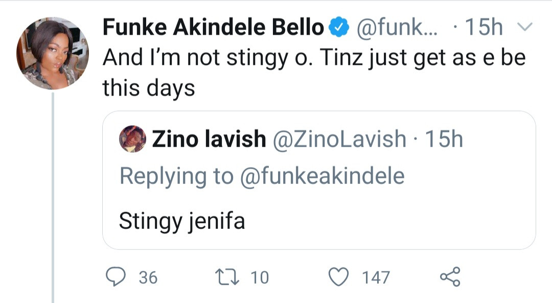 Responding, Funke wrote: "And I'm not stingy oh. Time just get as e be this days."