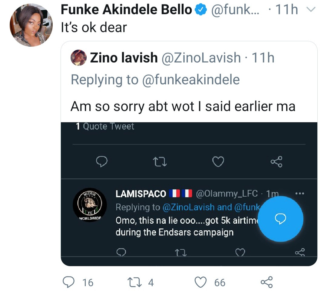 The follower who called Funke stingy was called out and he later apologized to the actress.