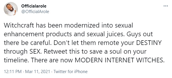 ''Witchcraft has been modernized into sexual enhancement products and sexual juices. Guys out there be careful. Don’t let them remote your DESTINY through SEX. Retweet this to save a soul on your timeline. There are now MODERN INTERNET WITCHES.''\