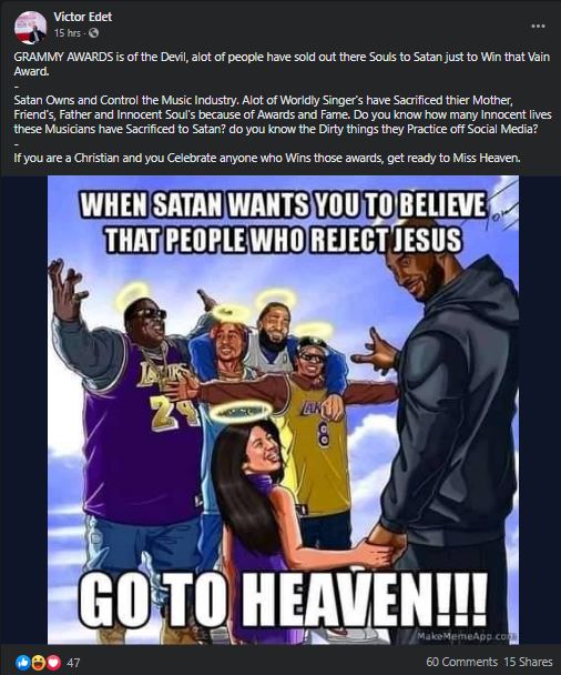 Evangelist Victor Edet took to his social media page to reveal that Satan controls the music industry and a lot of people have sold their souls to Satan just to win the Grammy Award.