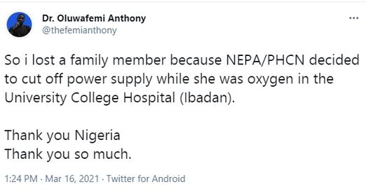 He tweeted; So i lost a family member because NEPA/PHCN decided to cut off power supply while she was oxygen in the University College Hospital (Ibadan). Thank you Nigeria Thank you so much.