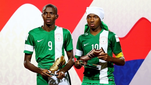 L-R: Victor Osihmen and Kelechi Nwakali poses with the adidas golden & bronze boot