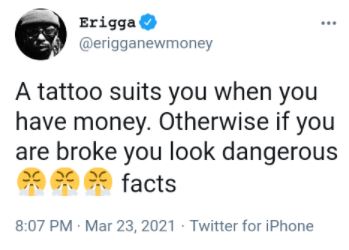 Popular rapper, Erhiga Agarivble has warned poor people against drawing tattoos.