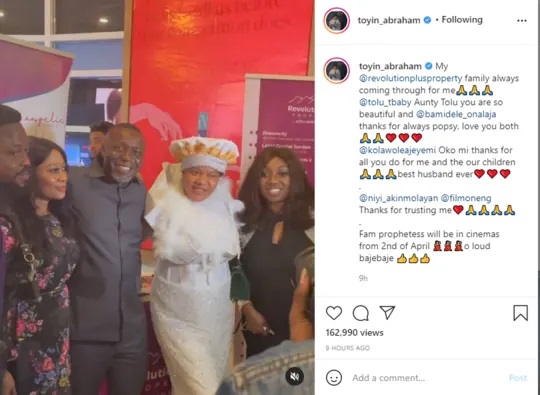 In an appreciation post for all those who played a part in seeing that the film records success, the mother of one specially thanked her husband, Kola Ajeyemi.